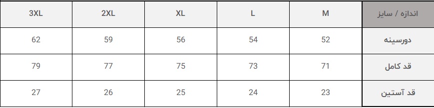 | سایز | M | L | XL | 2XL | 3XL | |